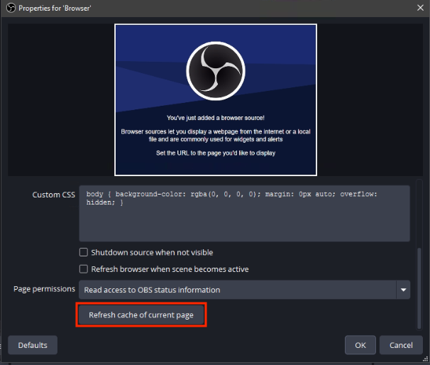 OBS makes it easy to recover from frozen browser sources with the Refresh cache of current page button in the browser source properties. For the fastest response during live streams, configure a hotkey for instant refresh access.